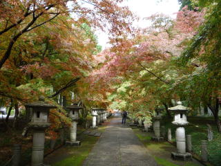| 仁王参がせり出した珍しい山門 | 紅葉のアーチの参道 |