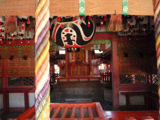 | 何に見えるかと提灯を見上げる | 境内にはえびす、大黒も祀られる |