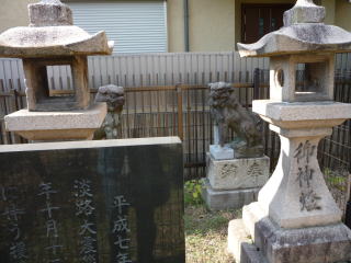 | 淡路大震災で壊れた鳥居 | 狛犬や灯篭が残されている |