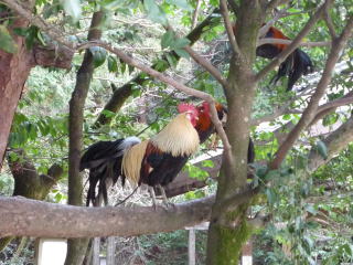 | 摂社拝殿も国宝指定されている | 神の使いとして飼われている鶏 |