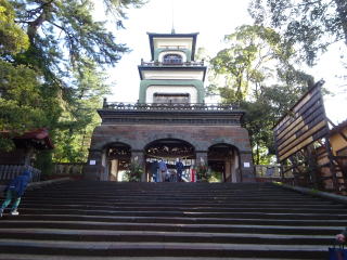| 神門をバックに参道から | 明治8年建築の神門 |