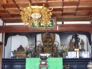 | 石塔と本堂を望む | 釈迦三尊毘沙門天が祀られる |