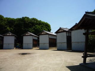 | 鳥居をくぐると広い境内に至る | 境内済みにだんじり小屋がたくさんある |