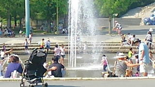 | 真夏日で噴水が大賑わい | 子度はずぶ濡れで大はしゃぎ |