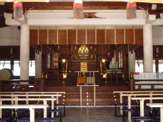| お参りが多さを感じる境内の風景 | 菊の御紋のある拝殿 |