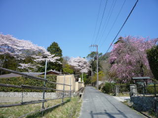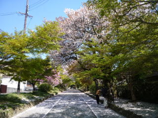 | 曼殊院を地図で調べたときにすぐ近くに鷺宮神社がある事が判りお参りすることにしていた、本日の最後になるが曼殊院から少し北に行きその辻を西に下ってすぐのところに神社は有ったその道中には桜がたくさん咲いており彩を楽しませてくれた。見事な枝ぶりの桜や民家に咲くしだれ桜など目を楽しませてくれた鷺森神社のお参りがすみ参道を修学院駅に向かい下ったが園亮脇にも沢山の桜があったが、散り初めていて道路が花びらで埋め尽くされ絨毯のようだった。今日はいたるところで桜見物が出来今年最後の花見を終えることができた。 |