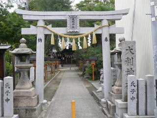 大利神社正面、後方には商店街につながる、境内は楠に囲まれている