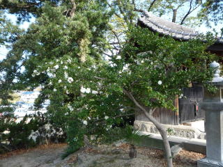| 拝殿横に白いつばき | きれいに咲いている白つばき |
