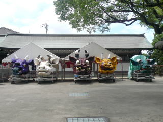 神田天満宮の本殿と大楠 奉納された牛の石像ともっちゃん2